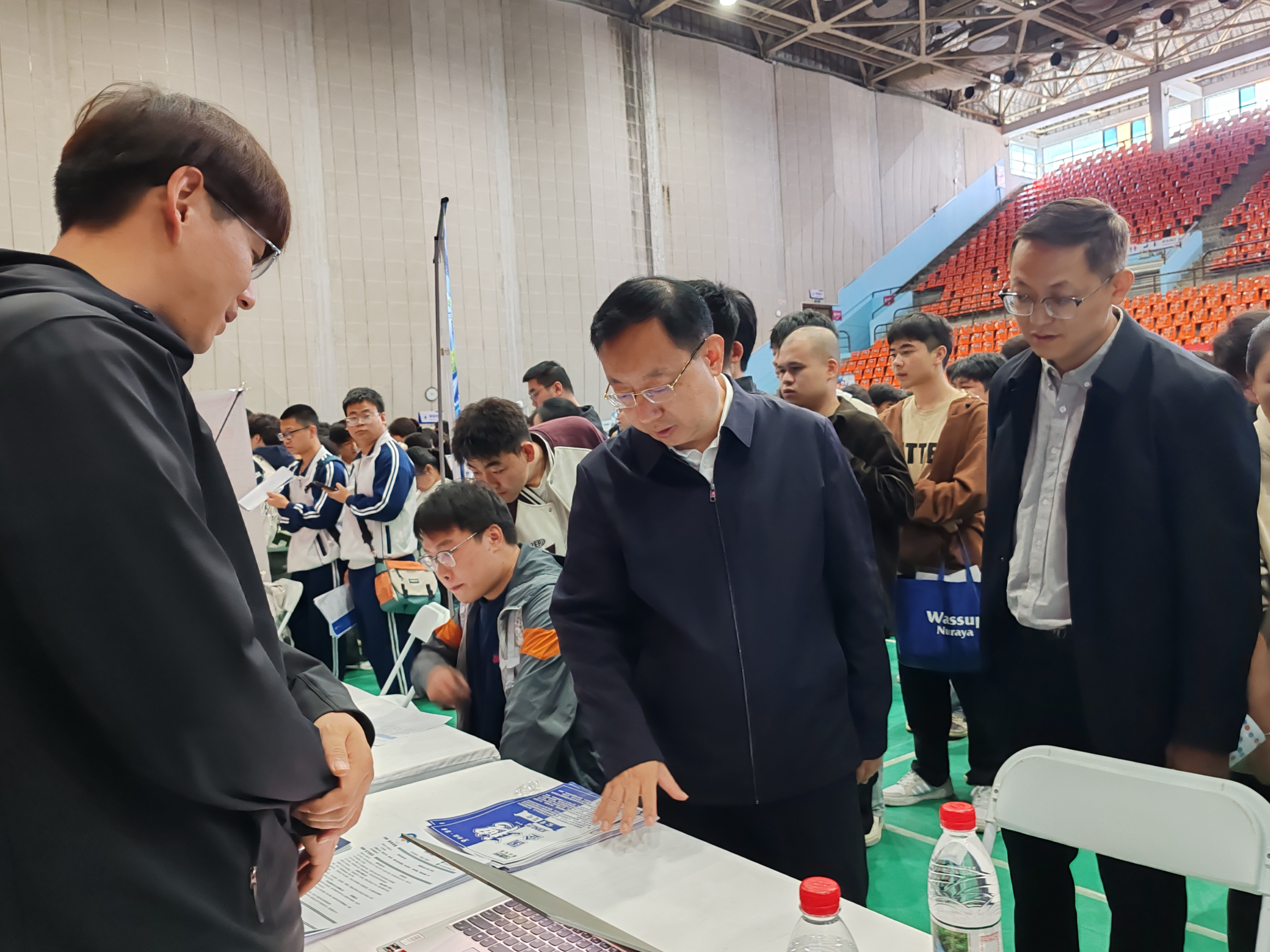 调研过程中,种宇宏逐一走访行业重点用人单位展位,与企业招聘负责人及校友亲切交谈。他详细询问企业招聘需求、岗位要求、薪资福利及行业发展情况,了解企业对我校毕业生专业能力、实践素养的综合评价,并向企业介绍我校学科建设、人才培养特色及2026届毕业生规模与专业分布情况。希望校企双方以人才供需对接为窗口,进一步深化校企合作,建立长期稳定的人才输送与联合培养机制,共同为行业发展培育优质人才。在与毕业生交流时,他关切询问同学们的求职意向、目标岗位及面试进展,倾听大家在求职过程中遇到的困惑与需求。他叮嘱同学们要结合自身专业优势与职业规划,理性选择岗位,主动与用人单位沟通,同时鼓励广大毕业生到西部去、到基层去,到祖国最需要的地方建功立业,强调要树立“先就业、再择业”的正确就业观,积极把握就业机遇,在统筹社会价值的过程中实现个人价值。