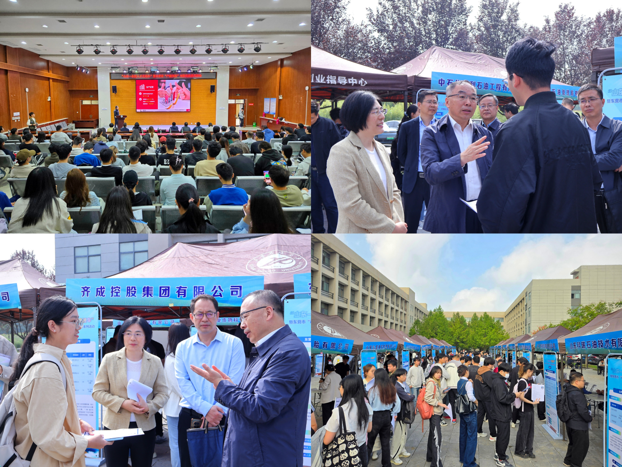 与此同时,东营市组团专场招聘会在崇文楼118报告厅和江汉林广场同步开展,东营市公共就业和人才服务中心副主任朱凤鸾详细介绍了当地人才发展环境、住房补贴、就业扶持等优惠政策。多家重点企业代表围绕企业主营业务、岗位需求、发展前景等内容进行宣讲,现场解答学生关于职业规划、岗位要求等疑问,吸引两百余名毕业生到场聆听,为毕业生与企业搭建起直接沟通的桥梁。宣讲会后,省市领导在学校相关负责人陪同下前往招聘现场,实地查看毕业生求职情况。现场气氛热烈,毕业生们积极与企业招聘人员交流,围绕岗位专业要求、薪资待遇、职业发展空间等问题深入咨询,部分学生与企业初步达成就业意向。随后,校地双方领导参观我校校史馆及铁人王进喜纪念馆,通过历史图片、实物展品与文字介绍,全面了解我校的发展历程、办学成就与人才培养特色,对我校长期扎根能源领域、为国家能源事业发展作出的贡献给予高度评价。