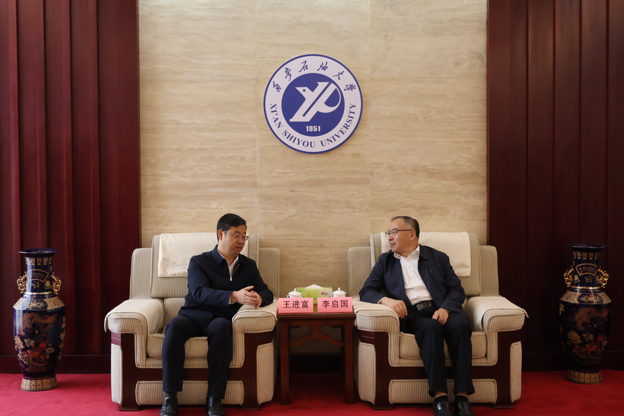 9月25日上午,“山东—名校人才直通车”暨东营市“产融百校”对接交流系列活动在我校鄠邑校区举办。山东省公共就业和人才服务中心副厅级干部李启国、东营市人力资源和社会保障局党组成员、市公共就业和人才服务中心主任李长林等省市领导参加活动。校长王进富在图书馆接待室会见李启国一行,向山东省、东营市人社部门对学校发展给予的支持表示感谢,并预祝活动圆满举行。校党委委员、副校长张君涛出席相关活动。我校学生工作部(处)(就业创业指导中心)、科研处、校友工作与合作交流处相关负责人陪同参加。